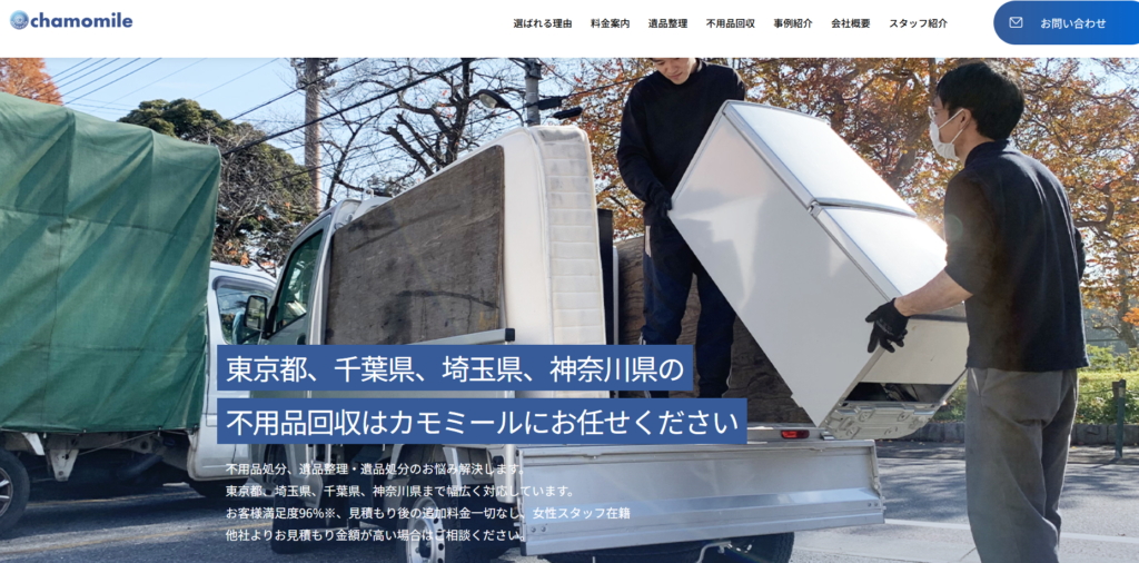 カモミールは、足立区に対応する業者です。不用品回収を中心に、ゴミ屋敷片付けや遺品整理まで幅広いサービスを提供しています。軽トラックパックなら14,800円から利用でき、家具・家電が混在した片付けにも柔軟に対応している点が特徴です。
