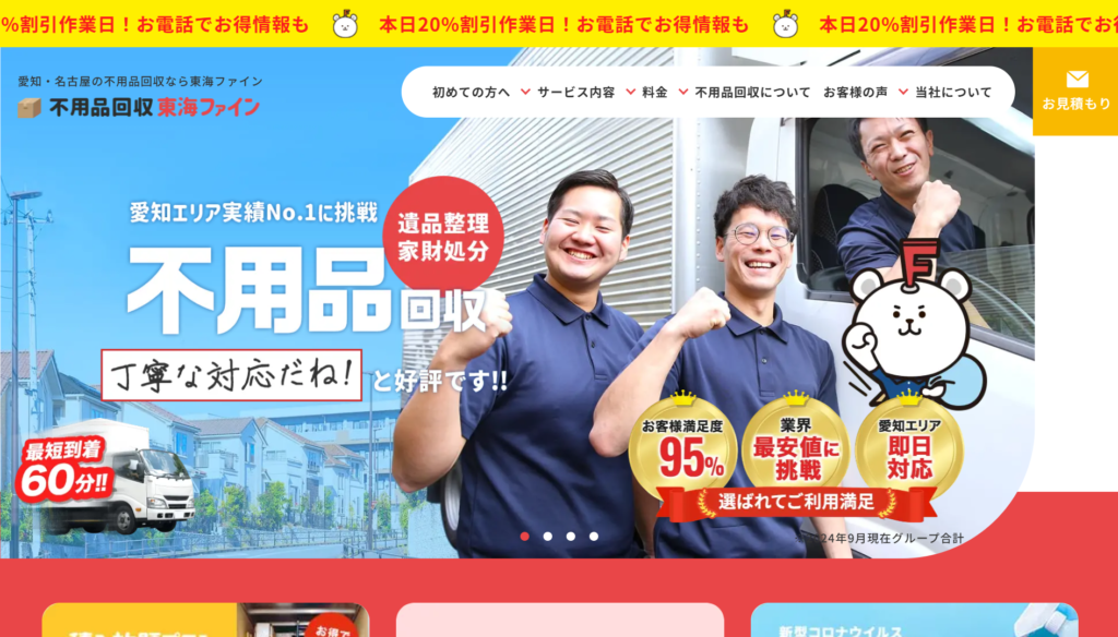 | 2 | 東海ファイン | 4.0/5.0 | 愛知県は即日対応可能 | 愛知県全域 (一部除く) | 提携◯ | 在籍◯ | 加入済◯ | 対応可◯ |
