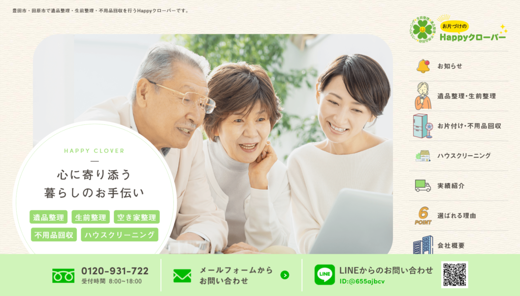 | 4 | happyクローバー | 3.5/5.0 | 現場作業は女性スタッフの対応も可能 | 愛知県全域 (一部除く) | 有り◯ | 在籍◯ | 加入済◯ | 対応可◯ |