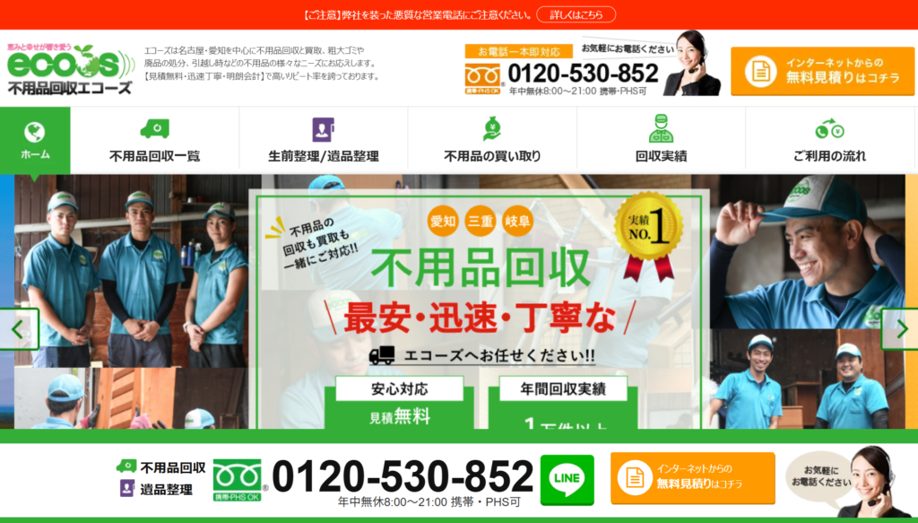 | 5 | 不用品回収 エコーズ | 3.5/5.0 | 見積もり後のキャンセル料無料 | 愛知県全域 (一部除く) | 提携◯ | 在籍◯ | 記載なし | 対応可◯ |