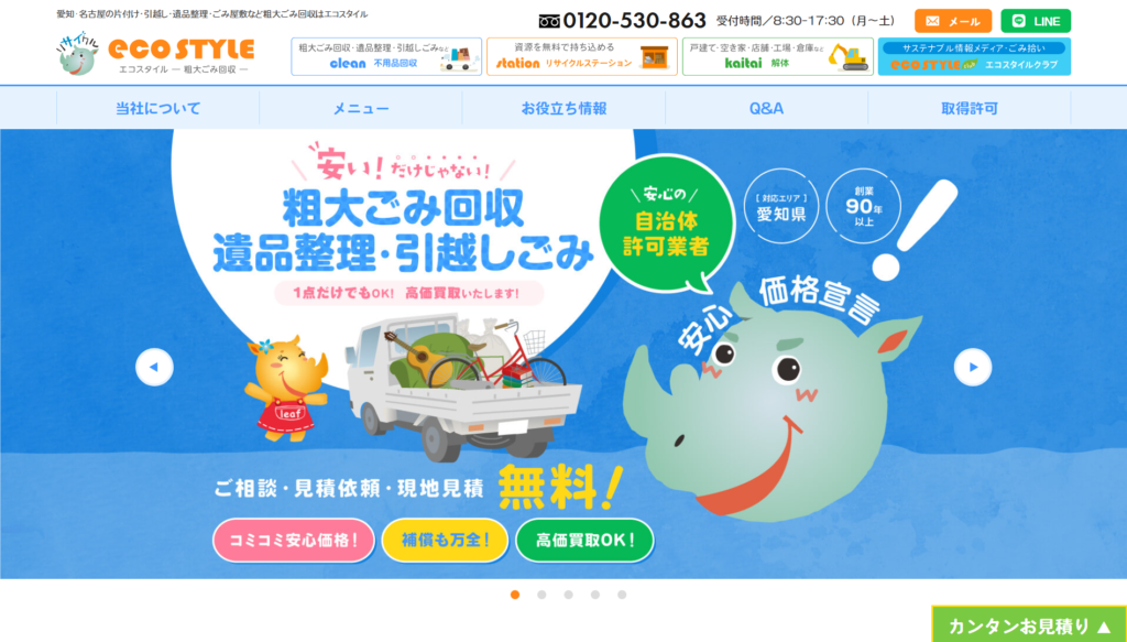 | 6 | エコスタイル | 3.5/5.0 | 作業料金から買取料金を差し引き可能 | 愛知県全域 (一部除く) | 有り◯ | 記載なし | 加入済◯ | 記載なし |