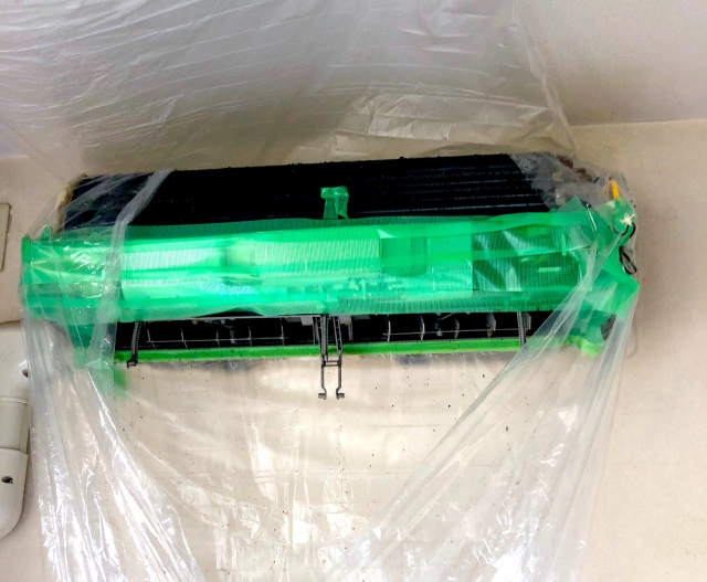次に、専用の養生カバーで周囲を保護したうえで、高圧洗浄機と専用洗剤を使って内部のカビやホコリ、汚れを徹底的に除去します。使用する薬剤は、エアコン専用の中性洗剤やカビ除去剤で、人体やペットへの影響が少ないものが一般的です。