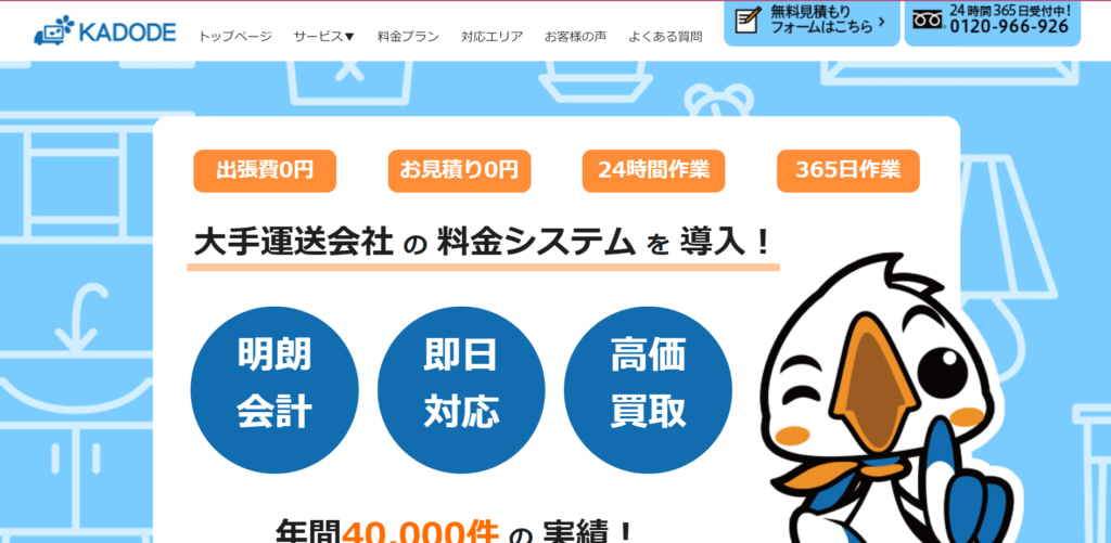 KADODEは、ADW株式会社が1都2府24県で運営している不用品回収業者です。 大手運送会社の料金システムを導入し、わかりやすい料金システムと即日対応と高価買取に力を入れています。 実績は年間40,000件です。連絡後最短1時間で来てくれる、安心できる回収... -