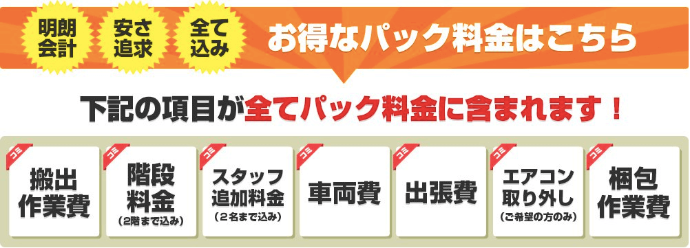 各パック料金には搬出作業費、掃除作業費、スタッフ追加料金、車両費、出張費、エアコン取り外し費用がすべて含まれます。見積もり後の追加料金もありません。