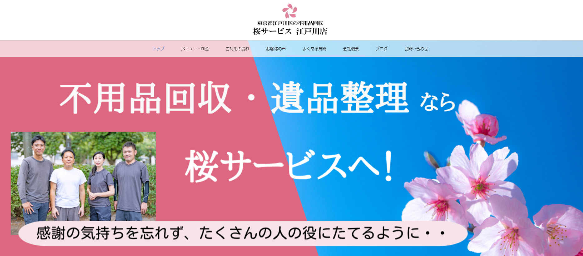 桜サービスは、江戸川区に対応する業者です。大型家具や家電の回収から引越しサポート、遺品整理や空き家整理まで幅広いサービスを提供しています。作業は「一現場一担当制」を採用しており、最初から最後まで同じスタッフが対応するため、要望の行き違いが起こりにくい点が特徴。