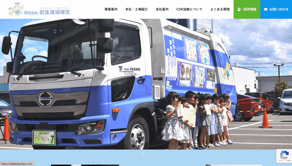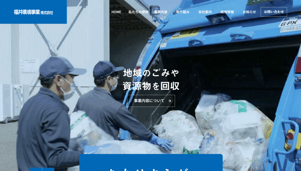 | 8 | 福井環境事業 株式会社 | 3.5/5.0 | ゴミ収集や清掃活動を行う創業70年の企業 | 福井県全域 (一部除く) | 有り◯ | 記載なし | 記載なし | 記載なし |
