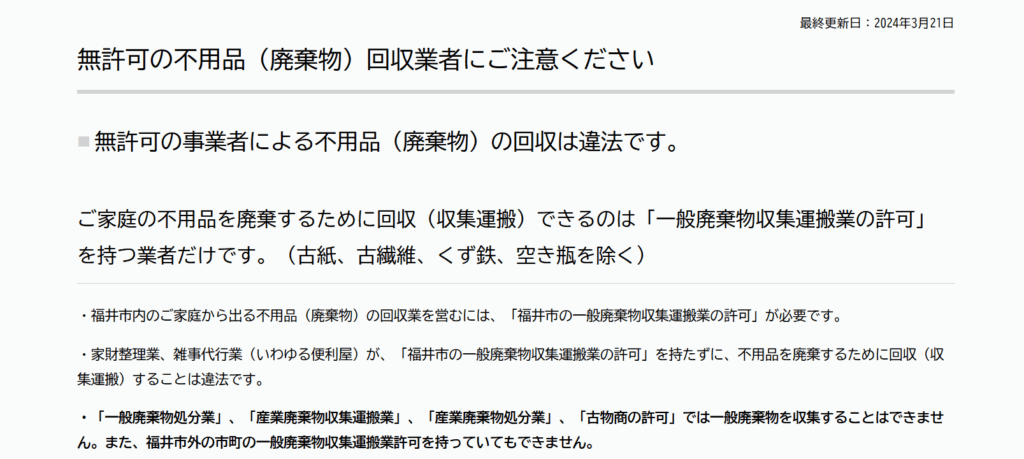 出典:福井市「無許可の不用品(廃棄物)回収業者にご注意ください」