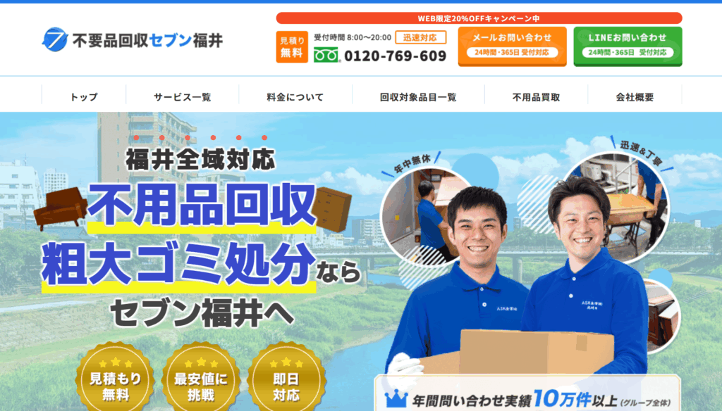| 2 | セブン福井 | 4.5/5.0 | WEBからの申し込み限定で20%OFF | 福井県全域 (一部除く) | 提携◯ | 在籍◯ | 加入済◯ | 対応可◯ |