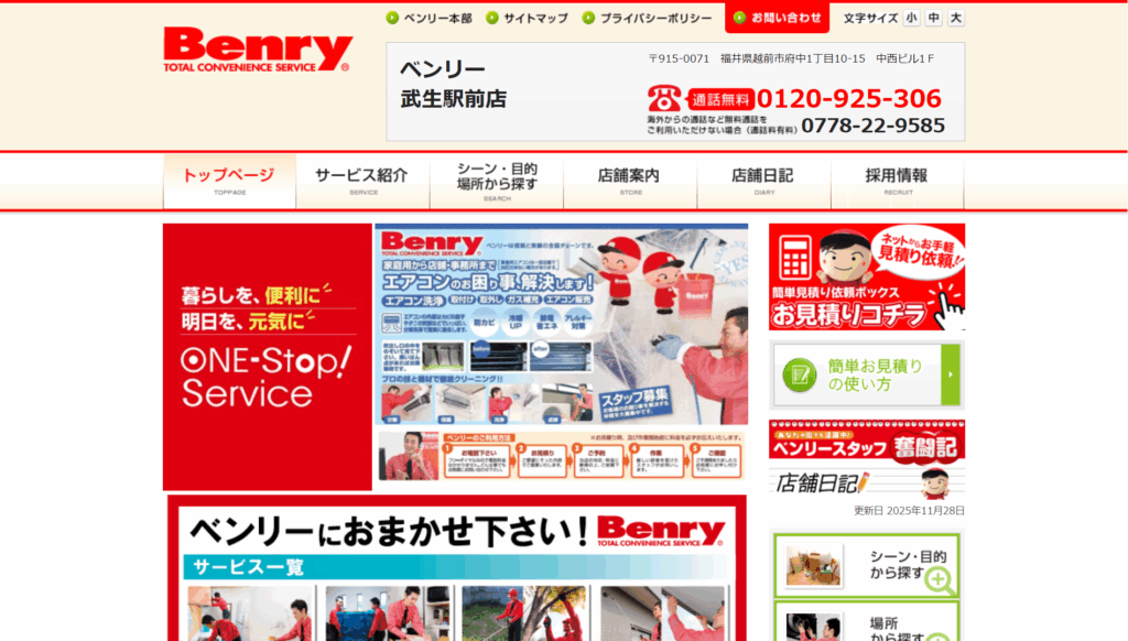 | 6 | benry | 3.5/5.0 | 困り事を解決するさまざまなサービスを展開 | 福井県全域 | 有り◯ | 記載なし | 加入済◯ | 記載なし |