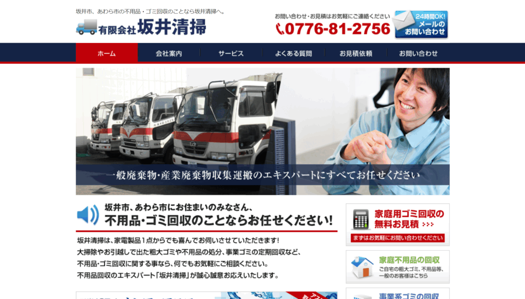 | 7 | 有限会社坂井清掃 | 3.5/5.0 | 大きなもの・小さなもの問わず1点から回収 | 福井県全域 (一部除く) | 有り◯ | 記載なし | 記載なし | 記載なし |