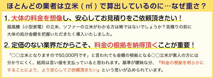 それは立米よりも重さの方がわかりやすいので、料金の根拠をはっきりすることで安心してもらうという目的があります。