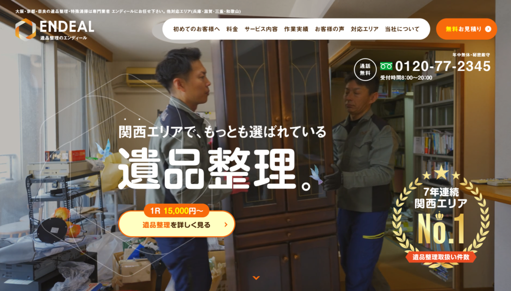 | 2 | ENDEAL | 4.5/5.0 | 遺品整理協会認定の優良事業所 | 大阪府全域 (一部除く) | 提携◯ | 在籍◯ | 加入済◯ | 対応可◯ |