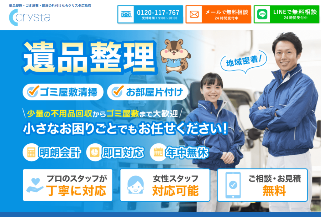 | 1 | クリスタ | 4.8/5.0 | 遺品整理に携わるサービスが豊富 | 広島県全域 | 提携◯ | 在籍◯ | 加入済◯ | 対応可◯ |