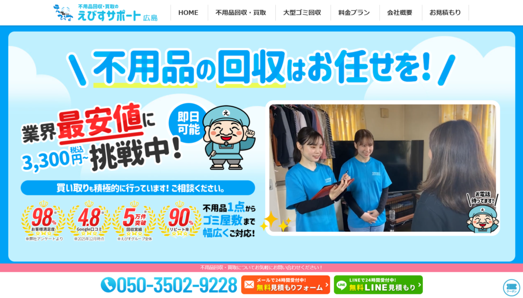 | 3 | えびすサポート | 4.0/5.0 | 適正価格での買い取りが可能 | 広島県全域 (一部除く) | 提携◯ | 在籍◯ | 加入済◯ | 対応可◯ |