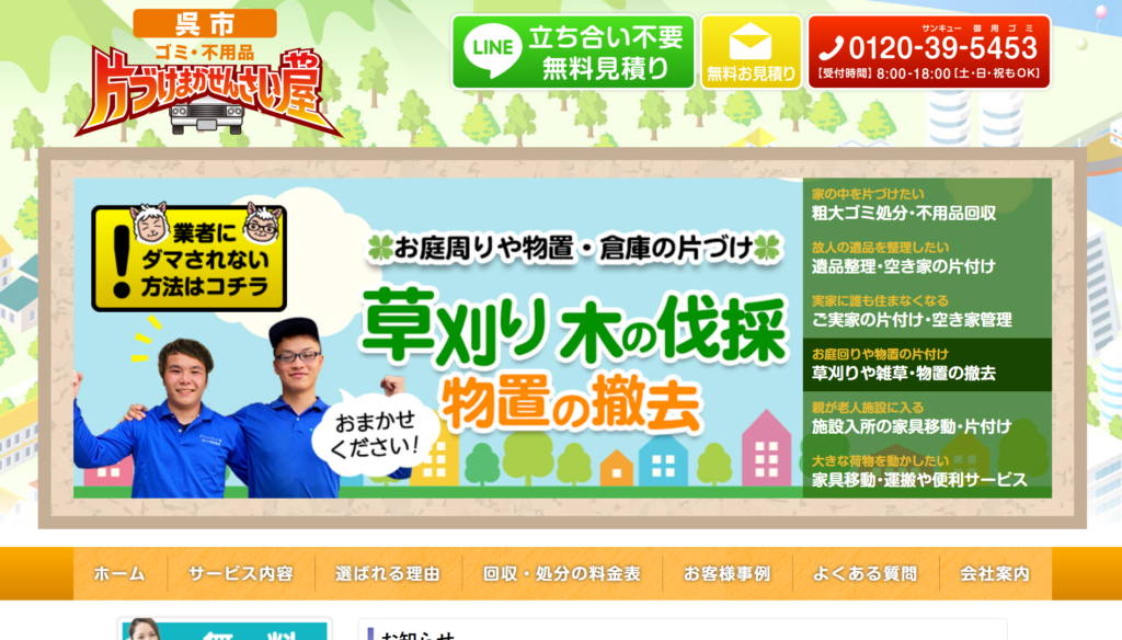 | 6 | 片付け まかせんさい屋 | 3.5/5.0 | 土日祝日や遅い時間も対応可能 | 広島県全域 (一部除く) | 有り◯ | 在籍◯ | 記載なし | 対応可◯ |