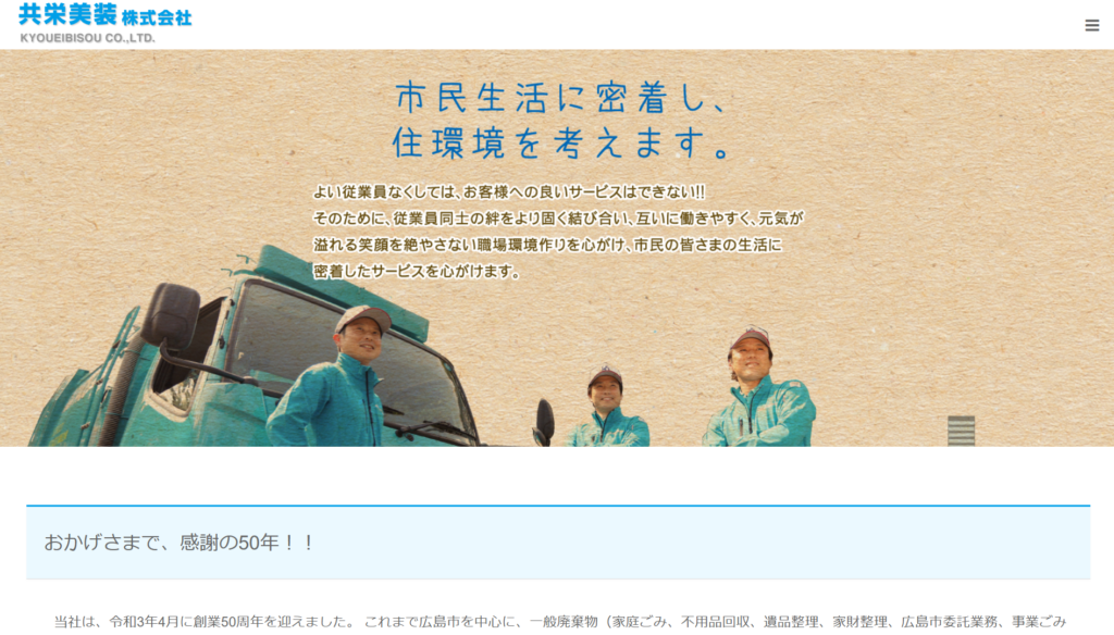 | 8 | 共栄美装株式会社 | 3.5/5.0 | 創業50年かつ遺品整理士在籍で安心 | 広島県全域 (一部除く) | 有り◯ | 在籍◯ | 記載なし | 記載なし |