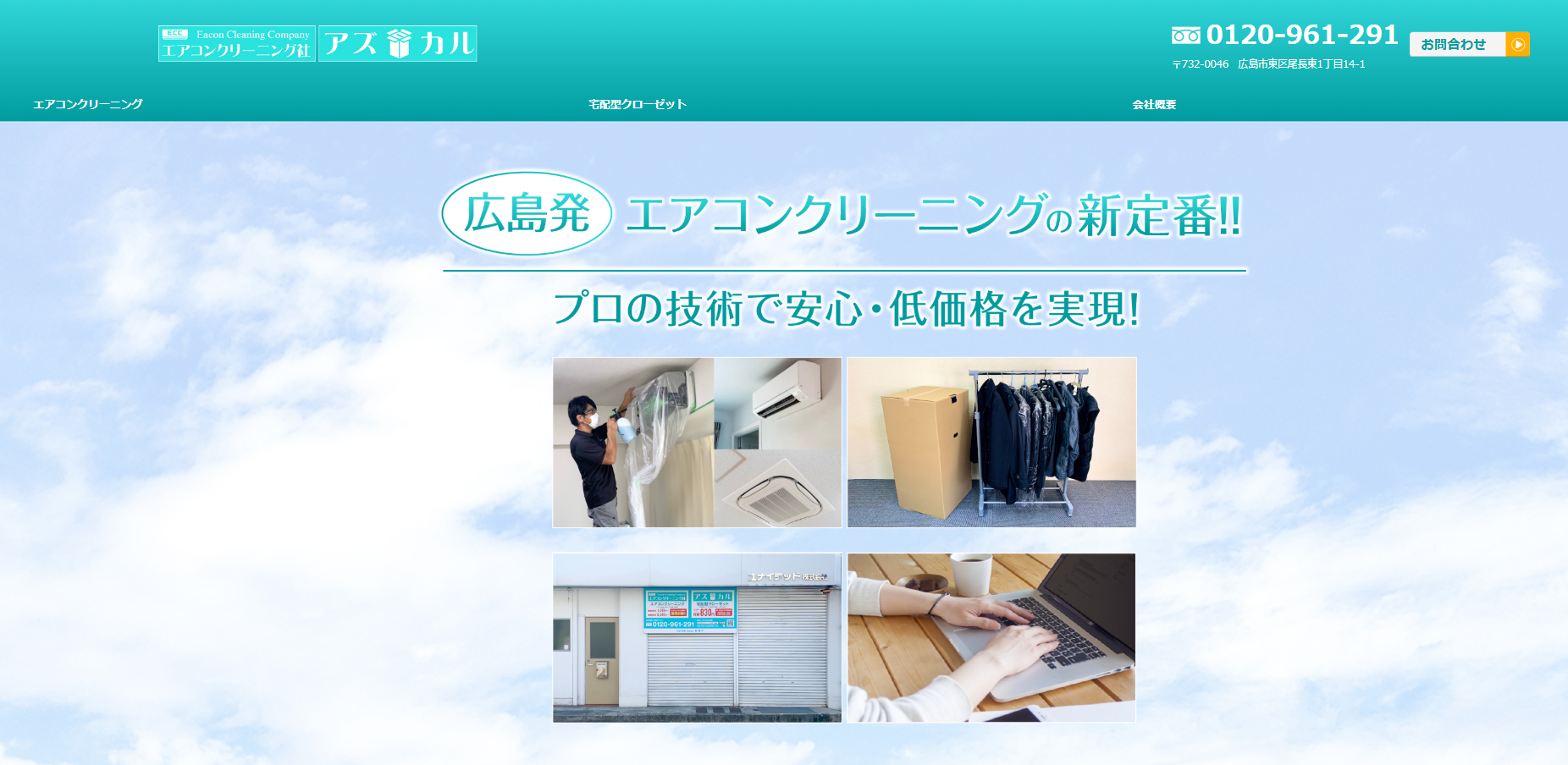 アズカルは、広島県を中心に作業を行っているエアコンクリーニング業者です。エアコンクリーニング以外には宅配型クローゼットのサービスも提供しています。料金は明朗会計で、最初に提示した見積もり金額以上の費用を追加請求されることはありません。