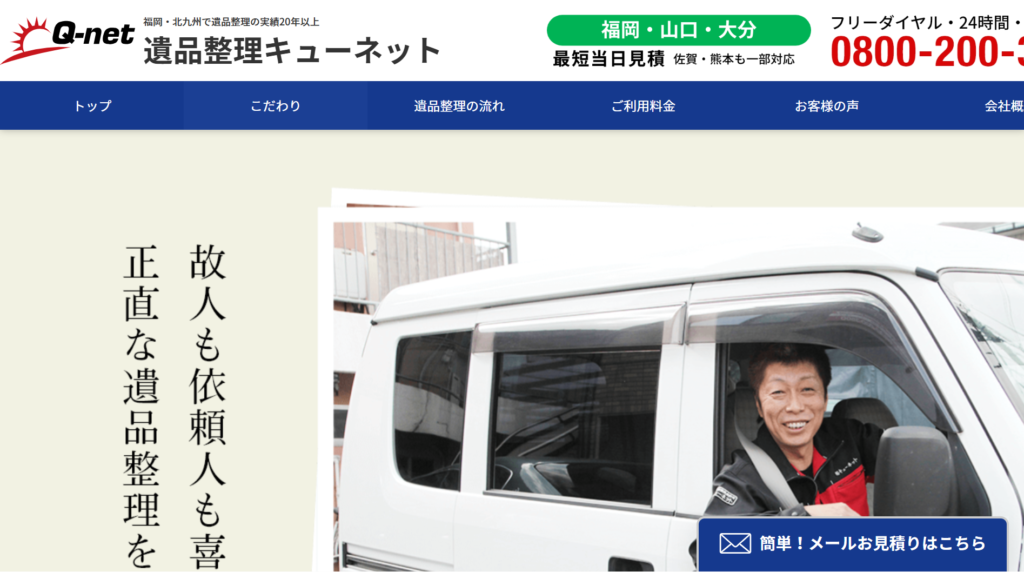 | 6 | 遺品整理 キューネット | 3.5/5.0 | 遺品発送や不動産の解体・売却までサポート | 福岡県全域 (一部除く) | 有り◯ | 在籍◯ | 加入済◯ | 対応可◯ |