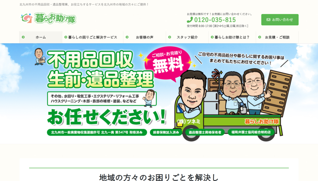 | 7 | 暮らしお助け隊 | 3.5/5.0 | 依頼から処理まですべて自社対応 | 福岡県全域 (一部除く) | 有り◯ | 在籍◯ | 加入済◯ | 対応可◯ |