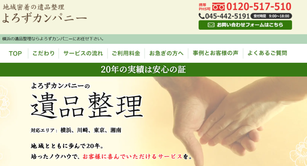 よろずカンパニーは、20年の作業実績を持つ地域密着型(横浜・川崎)の遺品整理業者です。不当な追加請求は一切なく、リーズナブルな価格で対応してくれます。また、家具家電・骨董品等の買取サービスも受け付けているので、費用を抑えて依頼したい方にもおすすめです。