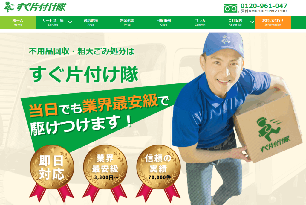 また、見積もり後の追加費用が一切発生しない「明朗会計」も安心ポイント。さらに、不用品の買取サービスを積極的に取り入れている点も特徴で、場合によっては片付け費用を大幅に抑えられるケースもあります。初めて片付け作業を依頼する方におすすめの業者です。