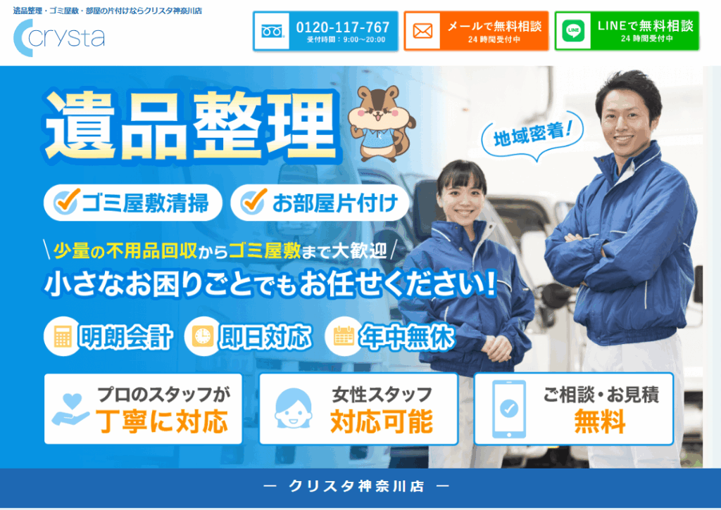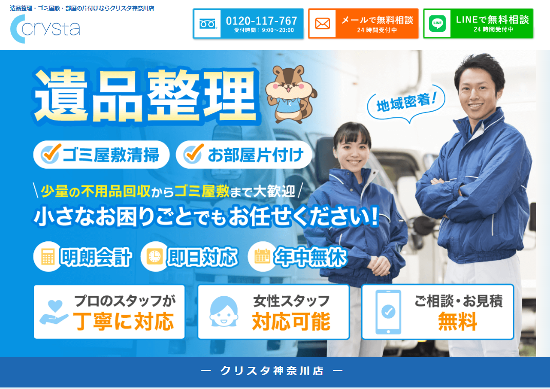 クリスタは、神奈川県全域に対応する業者です。ゴミ屋敷清掃や遺品整理はもちろん、不用品回収や部屋の片付けまで柔軟に対応しています。強みは「仕分けサービス」で、必要な物と不要な物が混ざっている状態でも、希望を確認しながら一つひとつ分別してくれます。