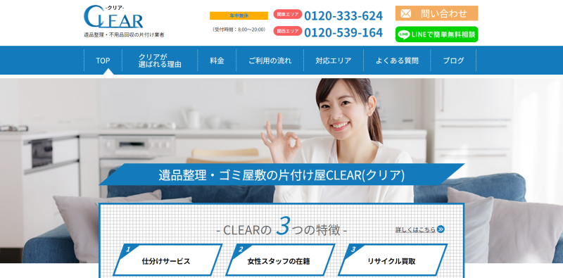 クリアは、神奈川県全域に対応する業者です。ゴミ屋敷の片付けや遺品整理、不用品回収など幅広く対応しており、「仕分けサービス」を設けている点が特徴。利用者の指示のもとに必要なものと不要なものを丁寧により分けます。