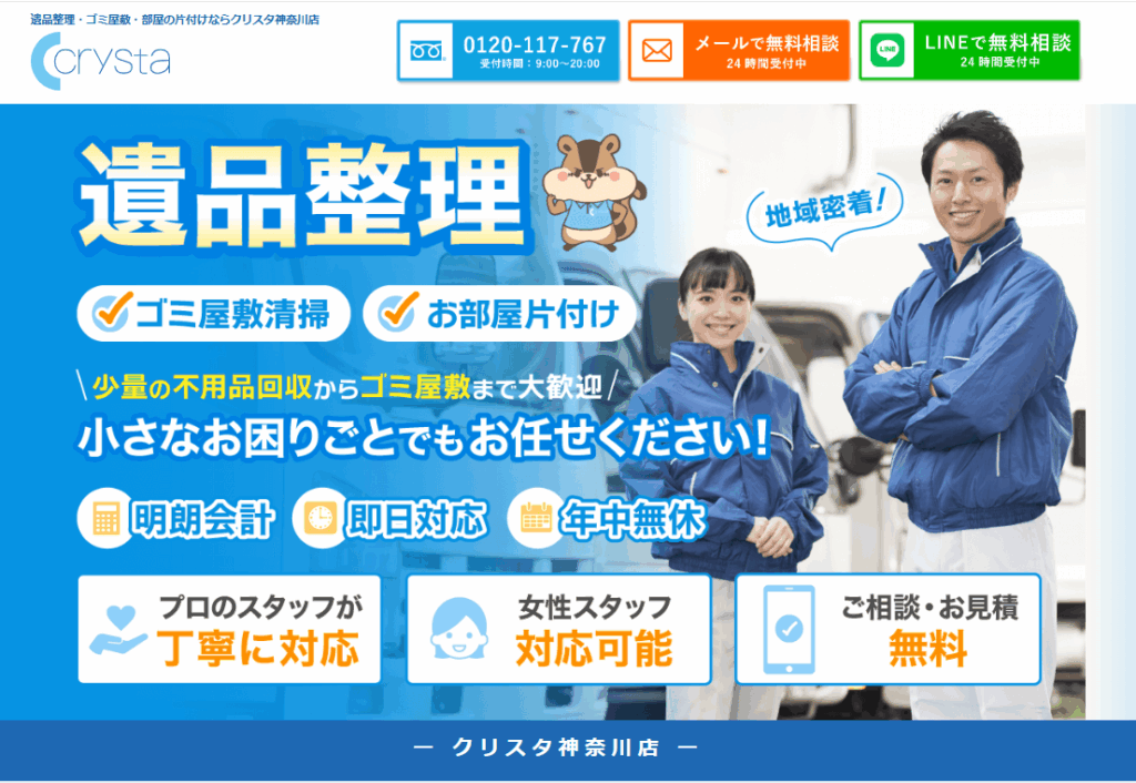 クリスタは、神奈川県全域で対応している業者です。遺品整理やゴミ屋敷清掃、部屋の片付け、不用品回収まで幅広く対応し、少量の不用品から大規模な片付けまでサービスを提供しています。特に魅力なのは「仕分けサービス」です。利用者の指示をもとに、必要な物と不要な物を丁寧に分けながら作業してくれます。