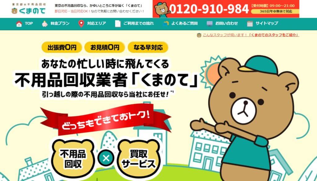 即日対応や、安心サービスが充実している不用品回収業者「くまのて」