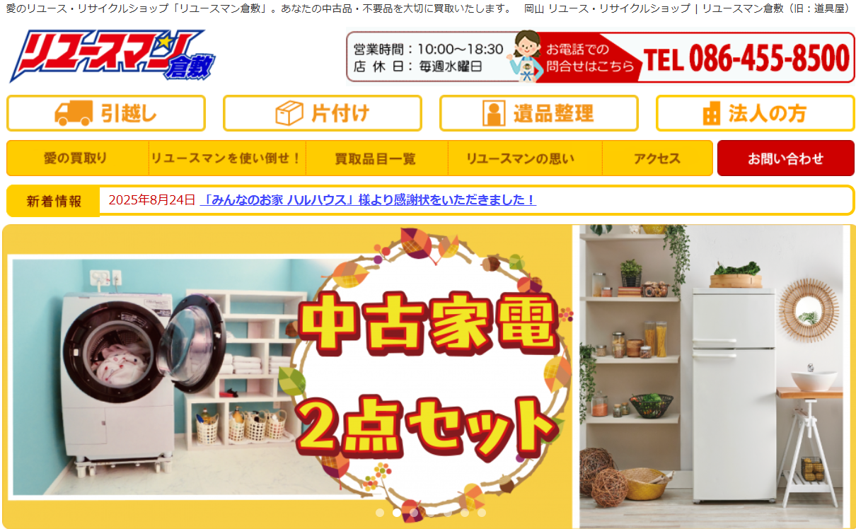 | 5.リユースマン倉敷 | ![]() | 3.5/5.0 | 公式 | 記載なし | 記載なし | ◯ 無料 | ◯ 加入済み | ◯ 有り | ◯ 有り | ◯ 有り | ◯ 法人 | 10:00〜18:30(毎夕水曜日定休) | 現金、クレジットカード、PayPay |