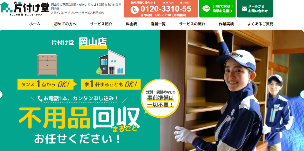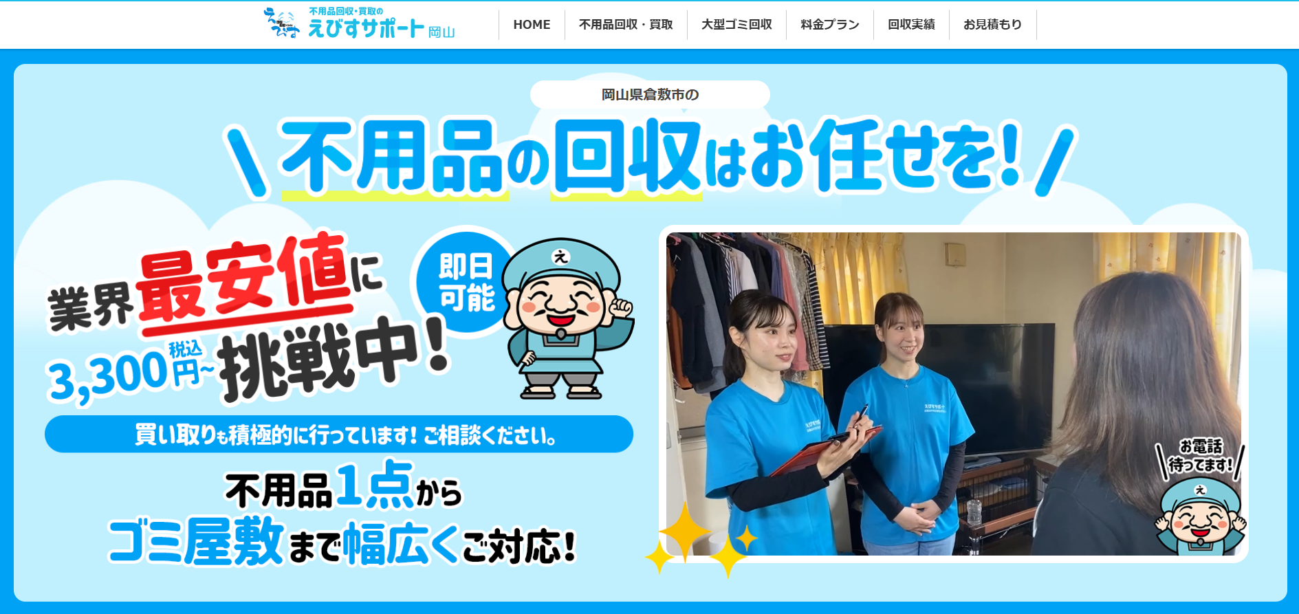 えびすサポート岡山は、家庭ごみや大型家具、家電製品の回収から、遺品整理・生前整理、リフォーム、さらにはハウスクリーニングまで幅広く対応していることが明示されています。