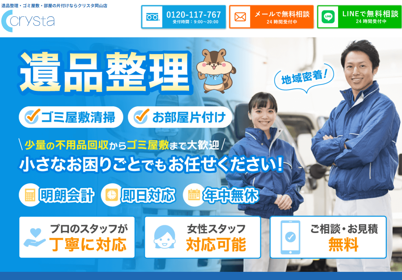 クリスタ岡山店は、岡山市を拠点に展開する遺品整理・不用品回収サービスの専門店です。家庭の片付けや引越し時の整理はもちろん、ゴミ屋敷などの特殊な状況にも柔軟に対応できる点が大きな強みです。