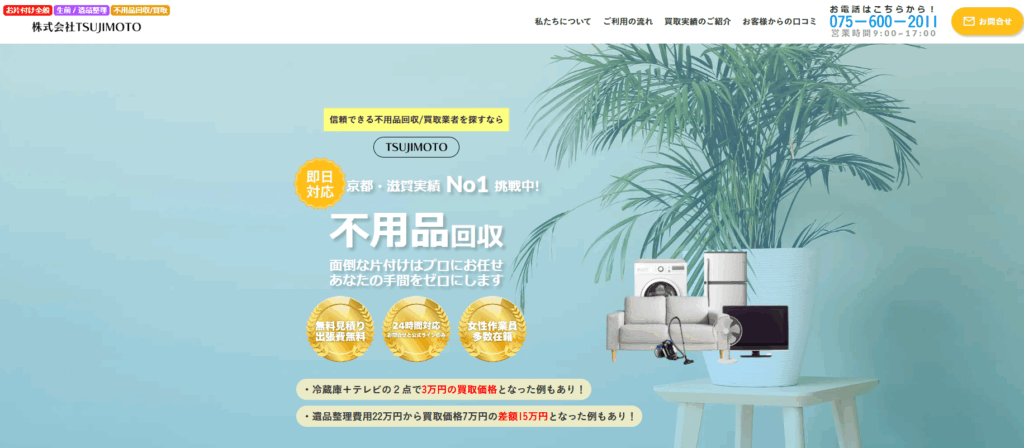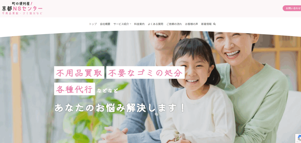 京都NSセンターは、京都市に対応する業者です。便利屋として、不用品の回収や買取はもちろん、家屋の解体前に出る大量のゴミ処分まで対応しており、片付けに関する困りごとをまとめて依頼できます。特徴は「解体とゴミ処分をセットにした割引プラン」があることです。
