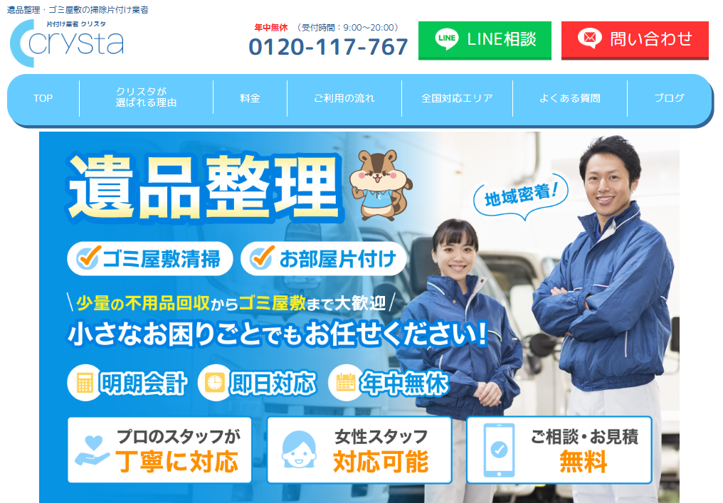 クリスタは京都市に対応する業者です。部屋の片付けから遺品整理、ゴミ屋敷清掃まで幅広く対応しています。特徴は「仕分けサービス」です。自分で必要・不要を判断するのが難しい場合でも、スタッフが指示に基づいて丁寧に仕分けをしてくれます。