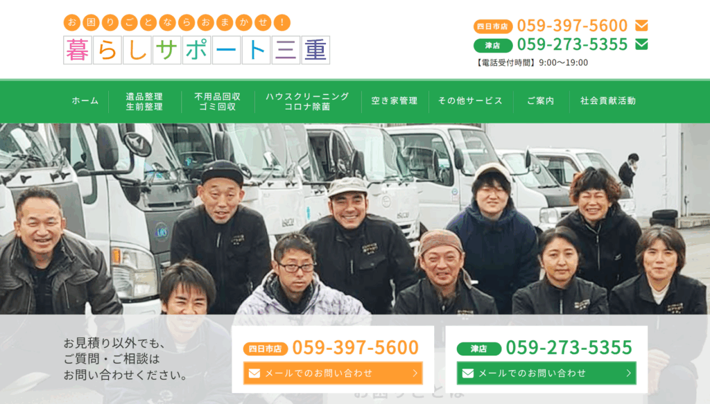 | 4 | 暮らしサポート 三重 | 3.5/5.0 | 遺品整理士が対応かつ仏壇のお性根抜きも可能 | 三重県全域 | 有り◯ | 在籍◯ | 記載なし | 対応可◯ |