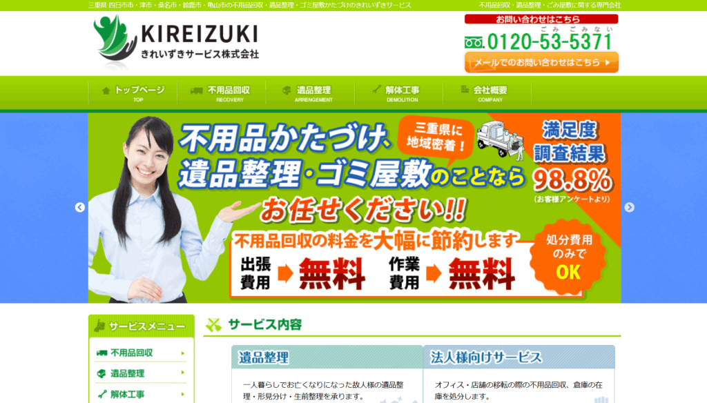 | 5 | きれいずき サービス株式会社 | 3.5/5.0 | 希望があれば女性スタッフの対応も可能 | 三重県全域 (一部除く) | 有り◯ | 在籍◯ | 加入済◯ | 記載なし |