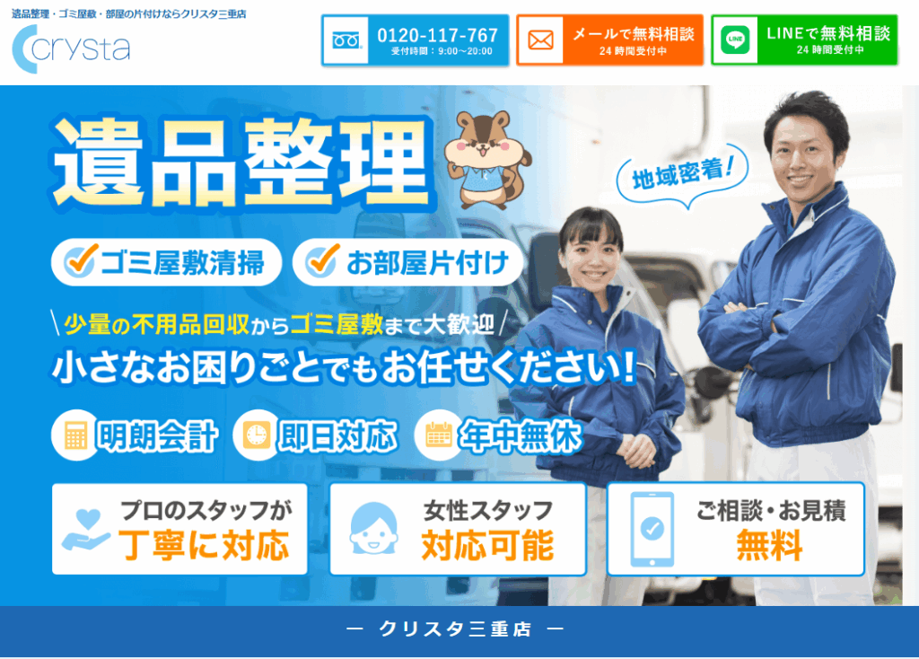 クリスタは、三重県全域に対応する業者です。ゴミ屋敷清掃・不用品回収・部屋の片付け・遺品整理まで幅広く対応しています。「即日対応」や「追加費用なしの明朗会計」は利用者から高く評価されており、急ぎの片付けや引越し前の整理に最適。