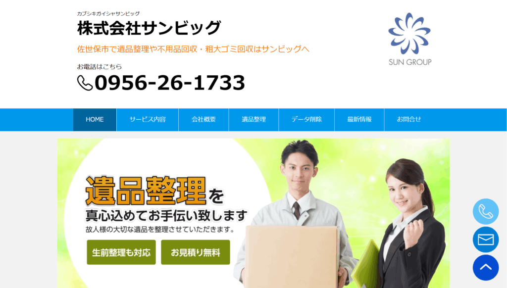 有限会社サンビッグはお客様の緊急のニーズに応えるため、見積もり無料で即日対応を基本としています。また、遺品整理で発生する不用品について、家具、家電、衣類、日用品などジャンルを問わず、1点からでも回収が可能です。
