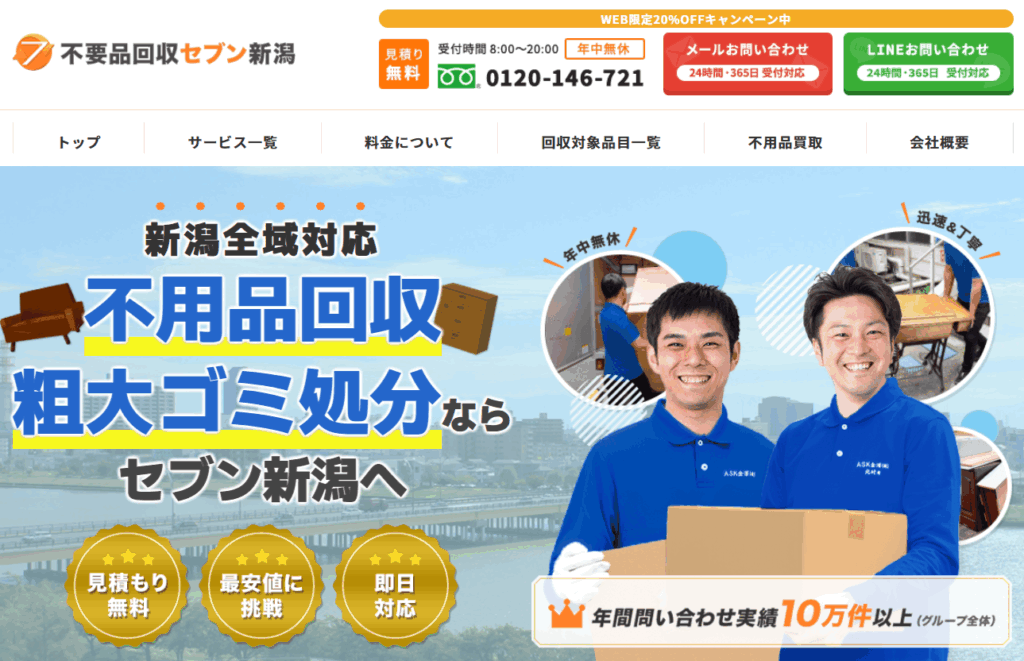 | 2.不要品回収セブン新潟 | ![]() | 4.5/5.0 | 公式 | 5,500円~ | ◯ 可能 | ◯ 無料 | ◯ 加入済み | ◯ 有り | ◯ 提携 | ◯ 有り | ◯ 法人 | 8:00〜20:00(年中無休) | 現金、クレジットカード、QRコード決済 |