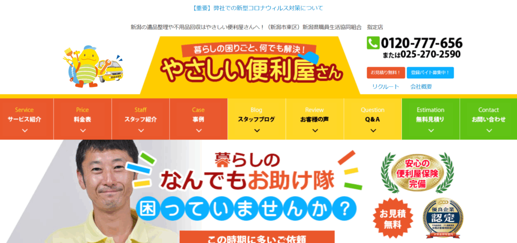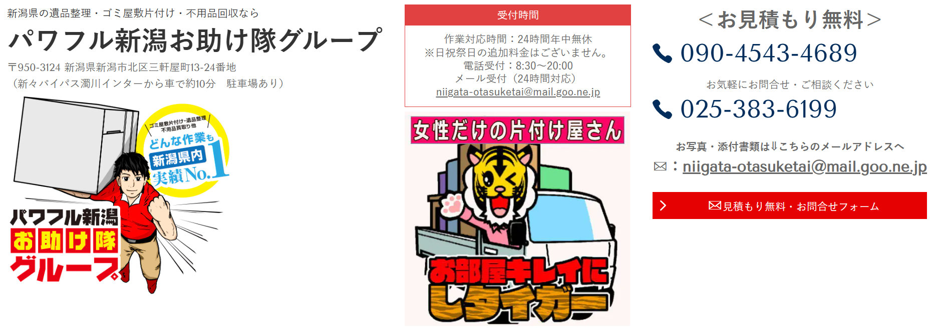 | 6.パワフル新潟お助け隊グループ | ![]() | 3.5/5.0 | 公式 | 記載なし | ◯ 可能 | ◯ 無料 | ◯ 加入済み | ◯ 有り | ◯ 提携 | ◯ 有り | 記載なし | 8:30~20:00 | 現金、クレジットカード |