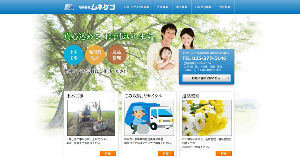 | 7.新潟市環境事業公社 | ![]() | 3.5/5.0 | 公式 | 記載なし | 記載なし | ◯ 無料 | 記載なし | ◯ 有り | ◯ 有り | ◯ 有り | ◯ 法人 | 8:30〜17:30 | 記載なし |