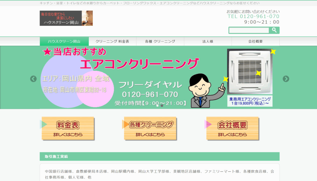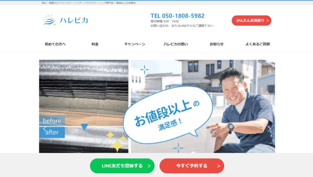 | 業者名 | ![]() ユアマイスター | ![]() おそうじ本舗 | ![]() カジタク | ![]() おそうじ革命 | ![]() ダスキン | ![]() ハレピカ | ![]() 岡山エアコンクリーニングサービス | ![]() 有限会社クリーンサポート | ![]() ハウスクリーン岡山 | ![]() アット!エアコンクリーニング |