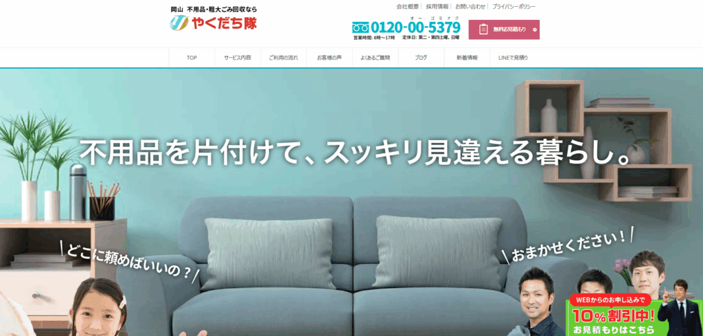 やくだち隊は、岡山県に対応する業者です。地域密着で培った豊富な実績が魅力。サービスは不用品回収から遺品整理、引越し後の片付け、ゴミ屋敷の清掃まで多岐にわたり、個人宅だけでなくオフィスや店舗の依頼もカバー。