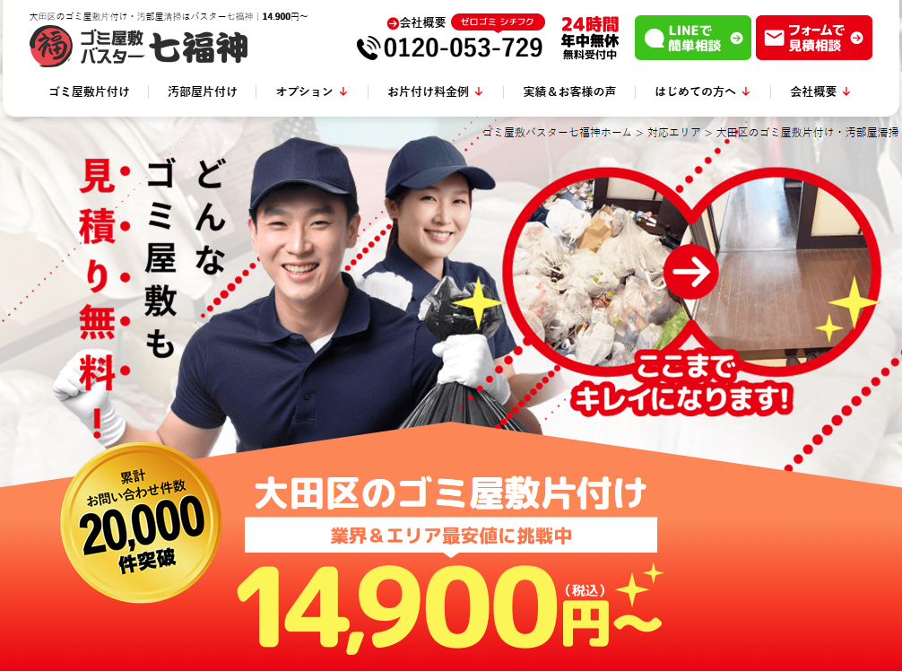 ゴミ屋敷バスター七福神は、大田区を含む東京都全域に対応する業者です。ゴミ屋敷片付けを中心に、汚部屋清掃、不用品回収、引っ越しに伴う片付け、ハウスクリーニング、遺品整理など多彩なサービスを提供しています。見積もりは電話・メール・LINE・訪問すべて無料で、内容に変更がない限り追加料金が発生しない料金体系を採用。