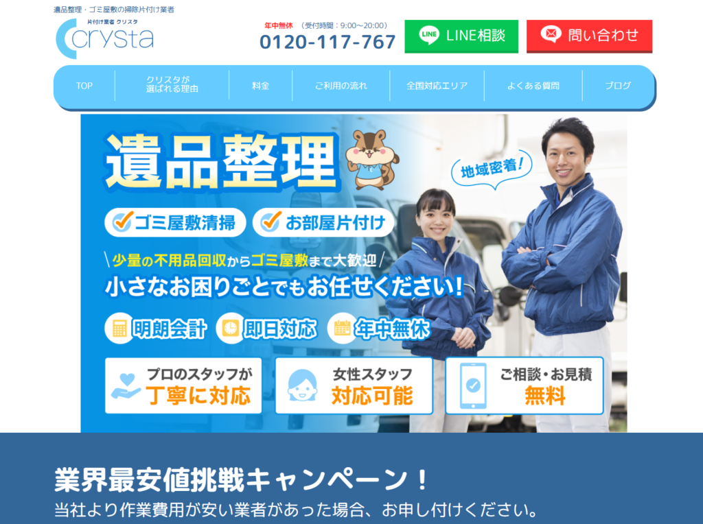 遺品整理業者を自分で探すのが大変な場合は、当サイト「クリスタ」でも遺品整理を承っています。現地訪問・お見積もりにも対応していますので、まずは状況のご相談だけでも大丈夫です。