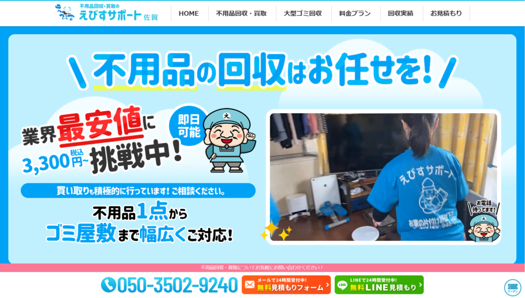 | 3 | えびすサポート 佐賀 | 4.0/5.0 | 1点から引き取り可能で買取もOK | 佐賀県全域 (一部除く) | 提携◯ | 在籍◯ | 加入済◯ | 対応可◯ |