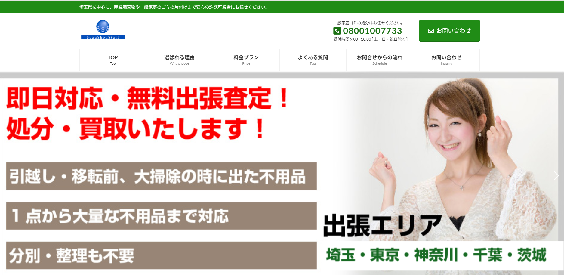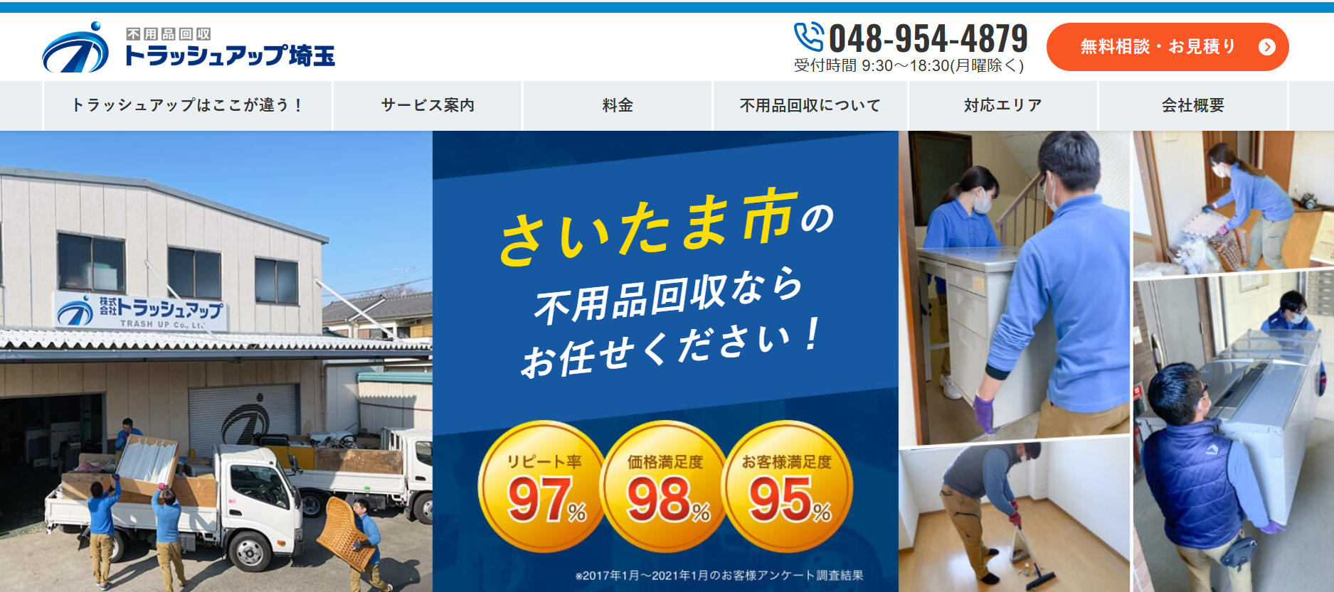 | 7.トラッシュアップ埼玉 | ![]() | 4.0/5.0 | 公式 | 5,000円~ | ◯ 可能 | ◯ 無料 | ◯ 加入済み | 記載なし | ◯ 有り | ◯ 有り | ◯ 法人 | 9:30~18:30(月曜除く) | 現金 |