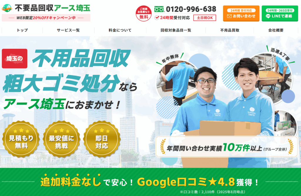 | 2.不要品回収アース埼玉 | ![]() | 4.5/5.0 | 公式 | 5,500円〜 | ◯ 可能 | ◯ 無料 | ◯ 加入済み | ◯ 有り | ◯ 有り | ◯ 有り | ◯ 法人 | 9:00〜20:00/年中無休 | 現金・クレジットカード |