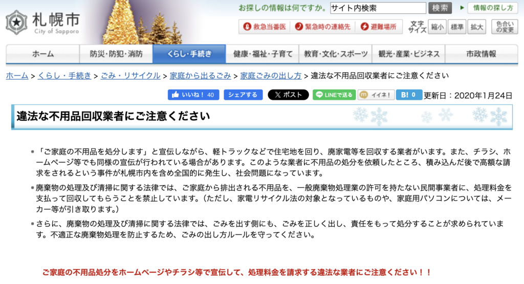 出典:違法な不用品回収業者にご注意ください|札幌市