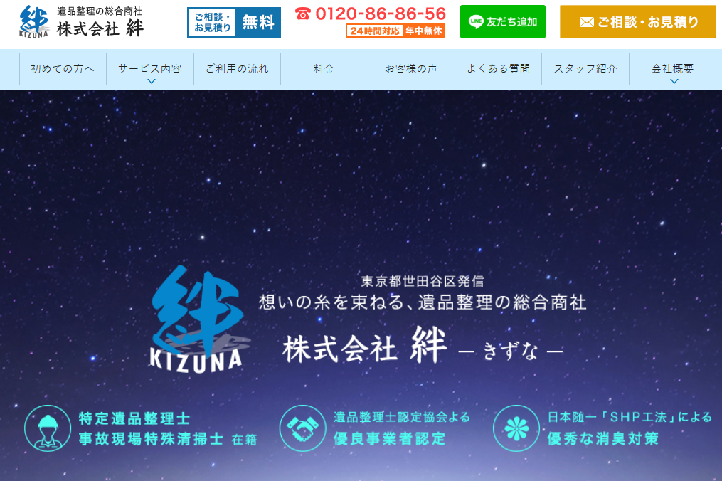 きずな屋は、世田谷区全域に対応する業者です。ゴミ屋敷や汚部屋片付け、遺品整理、不用品回収まで幅広いサービスを提供しています。仕分けから搬出、処分までまとめて依頼でき、必要な物と処分品を選り分けながら作業してくれる点が魅力です。